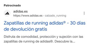 O este de Adidas que además tener una keyword parecida “zapatillas running”, cuenta con un segundo título que destaca una facilidad que ofrece su tienda online de devolver los artículos de forma gratuita durante 30 días. Seguramente algo que agradecen sus clientes habituales.