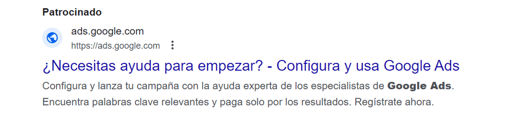 Google Ads hace un buen ejemplo con sus propios anuncios. Si colocamos Cómo hacer copys en Google Ads en el buscador nos aparece un anuncio donde la descripción dice clarísimamente el beneficio que el usuario va a conseguir al hacer clic: “configurar y lanzar una campaña, encontrar palabras clave y pagar solo por los resultados”. Y cierra con una clásica llamada a la acción “Regístrate ahora”