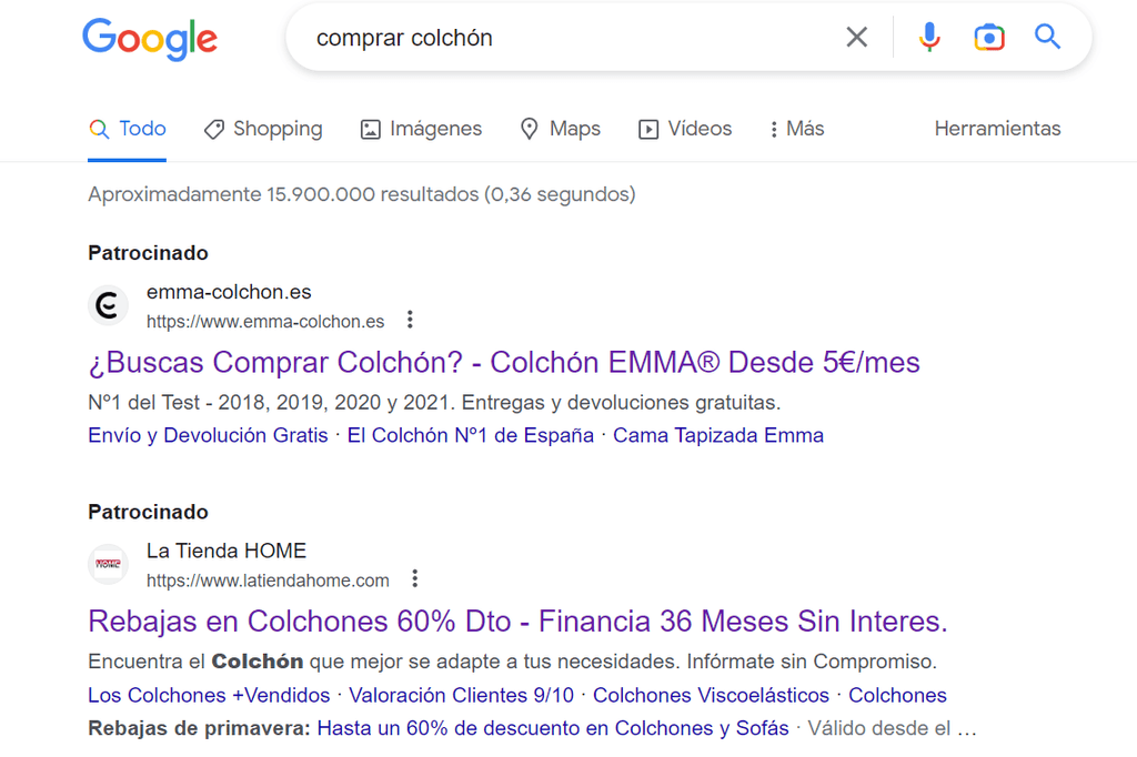 Colocando “comprar colchón” en el buscador de Google desde el ordenador, encontramos dos resultados de anuncios que nos sirven perfectamente para explicar cómo destacar algo único del negocio en los copys en Google Ads.