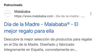 Y tenemos dos ejemplos perfectos de buenos copys en Google Ads en el día de la madre 2023. Por una parte encontramos un anuncio de la tienda Aplazame de moda y accesorios Malababa con un título con dos keywords combinadas “día de la madre” y “regalo”, directo y atractivo, así como una descripción bastante completa donde además de ofrecer variedad de productos, también destacan que son de fabricación nacional, seguramente un atributo importante para el perfil de sus cientes potenciales.