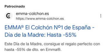 Por su parte Emma Colchón también tiene una campaña para esta fecha importante, con una anuncio igualmente atractivo aunque con algunas diferencias. En primer lugar encontramos un título triple que destaca que cuentan con el “colchón Nº 1 en España” que es el “Día de la madre” y que ofrecen un descuento enorme “hasta -55%”.