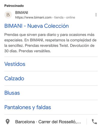 Google Ads también recomienda poner datos como ubicación o extensiones para realizar llamadas, enviar mensajes de forma directa a través de anuncios optimizados para estos dispositivos, así como apartados o links especiales que lleven a los usuarios a lugares concretos de la tienda online y así ahorrarles tiempo y facilitarles la toma de decisión a la hora de hacer clic. Este anuncio de Bimani destaca precisamente porque permite a sus clientas hacer clic directamente en la categoría de productos que buscan.